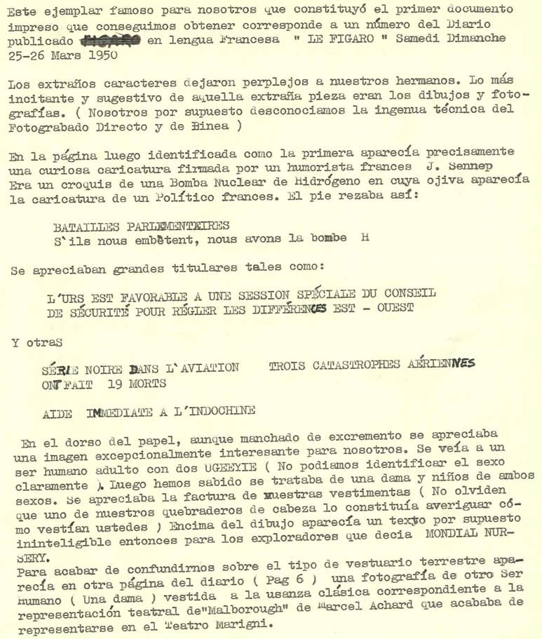 Las citas de LE FIGARO del 25-26 de marzo de 1950 hechas en la carta de los primeros días en Tierra (D57), recibida por Enrique Villagrasa el 20 de marzo de 1967, no son completamente acordes al contenido de la edición de las 5 de la mañana del diario. Están sin embargo en perfecta coherencia con la edición del día de ese diario y conteniendo diversas marcas de “exotismo”: