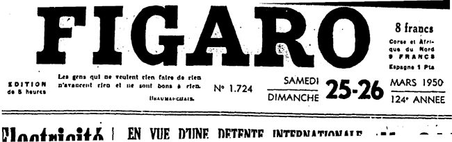 Tomé contacto, en diciembre de 2002, con el servicio de archivos del diario Le Figaro al que encargué la fotocopia de las páginas 1, 2 y 6 de Sábado Domingo 25-26 de marzo de 1950. Recibí unas fotocopias que, aun no siendo de gran calidad, son sin embargo explotables.