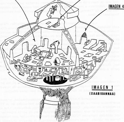 El conjunto puede ascender o descender hasta que el XAABIUANAA quede a flor de Tierra. Esto se consigue por medio de un sistema que como no es conocido en la TIERRA lo identificaremos con ciertos equipos neumáticos utilizados por ustedes. Se utiliza por supuesto una especie de PISTON (YOOXAO) y un largo cuerpo de bomba. La diferencia estriba en que en vez de Aire empleamos Vapor de Sodio. Este metal a baja temperatura permanece en estado sólido (IMAGEN 2). El Pistón pues ha descendido y con el nuestra XAABI. Mas cuando deseamos (Casi siempre al anochecer) emerger y elevarnos por lo tanto a un determinado nivel, un mecanismo excita por procedimientos de técnica nuclear, al sodio. Este pasa rápidamente al estado de vapor licuándose previamente y con un grado de expansión constante, haciendo que el émbolo (YOOXAO) ascienda con una velocidad constante (IMAGEN 3).