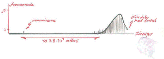 [4] The law of frequency allocation in the time, follows a function very singular, whose graph we expose next. In each social network of any cold star, a single individual of this called species OEMMIWOA begins to be generated by chance. Soon a long interval passes without the phenomenon takes place, to make appearance more passed many million years.