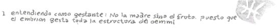 Hemos de puntualizar que el supuesto de yugulación del embarazo humano es casi desconocido en UMMO dentro de nuestra era. We must point out that the yugulación course of human pregnancy is almost unknown in Ummo in our era. El control biológico sobre el genoma del hijo, nuestras posibilidades de asistir biotécnicamente todo el curso de la gestación (Que nunca se hace “In Vitro” es decir en medio externo a una matriz dentro de la YIE  pese a que la posibilidad de desarrollo gestante no solo dentro de un equipo de laboratorio, sino implantado en una matriz real biológica separada de la mujer es plenamente viable para nuestros embriólogos) descarta toda la gama de riesgos que lleven a una deformación teratológica en el nasciente y afectación patológica para la madre. Biological control of the child genome, our ability to assist biotech entire course of pregnancy (that is never done "In Vitro" in the external environment is a matrix within YIE although the possibility of developing non-pregnant only inside a computer lab, but implemented in a real biological matrix separated from the woman is fully viable for our embryologists) dismisses the whole range of risks that lead to a distortion in the nascent teratological and pathological involvement for the mother.