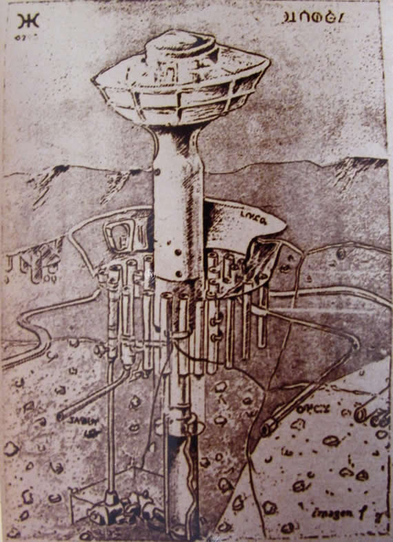 La única nota aparentemente discordante, son las torres vivienda que nosotros denominamos SAABI. Estas torres en forma de SETA TERRESTRE emergen algunas veces. Especialmente de noche, de su foso pozoidal del que pueden elevarse o descender a voluntad.