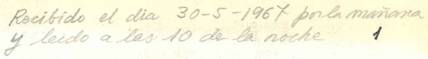 Primero: No revelarán el contenido de esta nota a ninguno de los organismos oficiales de la Administración Española, ni a ningún gabinete técnico privado del país, hasta después de verificada la llegada de nuestras astronaves. De todos modos y si no tuvieran conciencia de nuestra OAWOOLEAIDAA queda cancelado este compromiso a partir de las cero horas del día 4 de Junio de 1967.