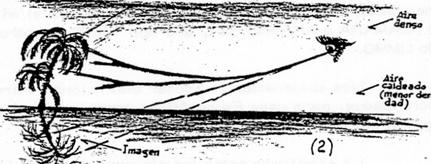 Todos ustedes conocen los fenómenos de espejismo provocados por la diferente densidad (DIBUJO 2) de los estratos de aire caldeados por el suelo tórrido de los desiertos.