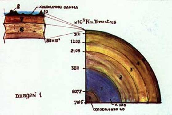La imagen 1 muestra una sección de nuestro OYAA (planeta) reflejando los espesores de las distintas XOODIUMMO. La composición química de estos estratos es muy variada. Así XOODIUMMO UO con una densidad media de 16,22 gramos/ cm2 (unidad de TIERRA) posee los siguientes elementos familiares a ustedes:
